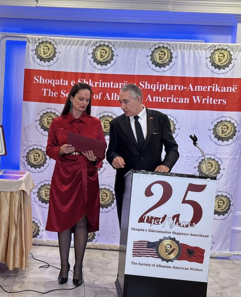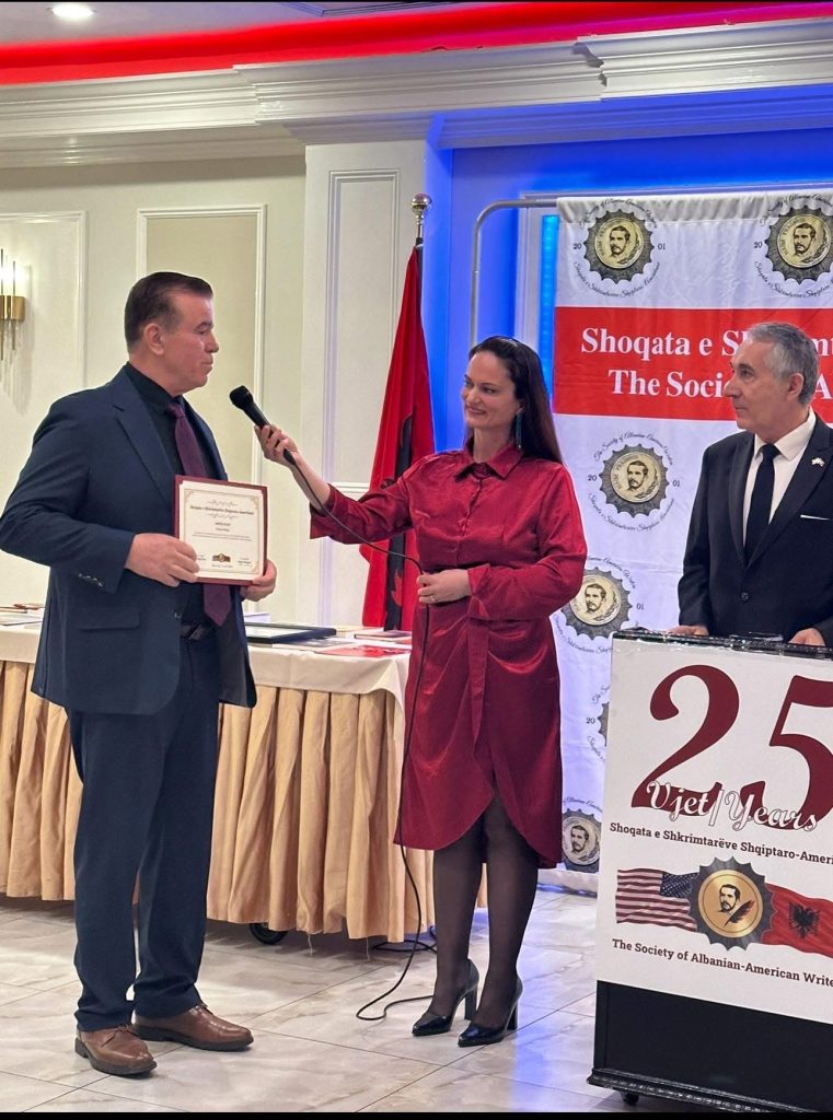 Një moment shumë emocionues ishte leximi i fjalës së Dr. Gjekë Marinaj “Letër” (Përgatitur për lexim publik), me titull: “Letërsia nuk është luks i qytetërimit: Ajo i përket formimit të njeriut.”Me respekt të thellë dhe me mirënjohje të sinqertë ju drejtohem në këtë 25-vjetor të themelimit të Shoqatës së Shkrimtarëve Shqiptaro-Amerikanë! Më 25 shkurt 2026 mora nga zoti Adnan Mehmeti ftesën për të qenë sot mes jush, një ftesë që përfshinte me bujari edhe bashkëshorten time, Dusita. Por, më 17 janar 2026 kisha marrë një angazhim të rëndësishëm akademik në Kinë, të lidhur me përgatitje të gjata dhe me detyrime që nuk mund të shtyheshin, ndaj sot nuk jam fizikisht në këtë sallë. Sot nuk dua vetëm t’ju përgëzoj. Dua t’ju ftoj të mendoni për madhështinë e kësaj dite dhe për peshën e misionit që ajo na kujton. (…) Shikoni përreth me qetësi dhe mendoni për ata poetë, shkrimtarë e miq të fjalës që kanë qenë pjesë e këtij udhëtimi, por sot nuk janë në këtë sallë. Disa i ka marrë koha. Disa i ka larguar jeta. Disa i ka shpërndarë mërgimi. Letërsia nuk është luks i qytetërimit. Ajo i përket vetë formimit të njeriut. Prandaj një shoqatë e shkrimtarëve shqiptaro-amerikanë nuk është vetëm bashkim autorësh. Ajo është urë ndërmjet atdheut dhe botës, ndërmjet kujtesës dhe së ardhmes, dhe diaspora fiton një shtëpi shpirtërore ku mund të njihet me vetveten, pa u mbyllur ndaj botës. Ju nuk jeni kujdestarë të një stine; ju jeni ndërmjetës midis të vdekurve që na lanë trashëgiminë dhe të palindurve që do ta marrin prej nesh. Letërsia që mbetet, është ajo që ndriçon më gjatë! Diaspora shqiptare, e cila jeton mes dy botëve ka nevojë për institucione serioze që ta mbajnë të gjallë trashëgiminë, pa e mbyllur ndaj së ardhmes. Sot, unë nuk dua vetëm t’ju përgëzoj për atë që keni arritur! Dua t’ju falënderoj për atë që keni ruajtur për një çerek shekulli. Është provë se një grup njerëzish të mbledhur rreth vlerës së fjalës mund t’i japin kohës së tyre diçka që i reziston harresës. Ju keni mbajtur gjallë një vatër të rëndësishme të kulturës shqiptare në Amerikë! Për këtë ju nderoj me gjithë zemër! Le të jetë ky jubile një ditë ripërtëritjeje.(…) Ju uroj një 25-vjetor të ndritur!