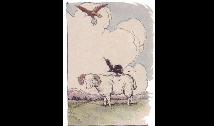 Një shqiponjë shigjetoi me vrull nga një shkemb i lartë dhe rrëmbeu nje qengj. Një sorrë që e pa, plasi nga zilia dhe deshi të bënte edhe ajo të njëjtën gjë. U ul me zhurmë dhe qëndroi mbi një dash. Po iu pleksën thonjtë në leshin e dashit, e nuk mundi të ngrihej. Rrahu ajrin me krahë me forcë, sa e pikasi bariu, i cili i shkoi pranë, e zuri dhe i preu ca pendë. Në mbrëmje e mori me vete dhe ua shpuri fëmijëve.