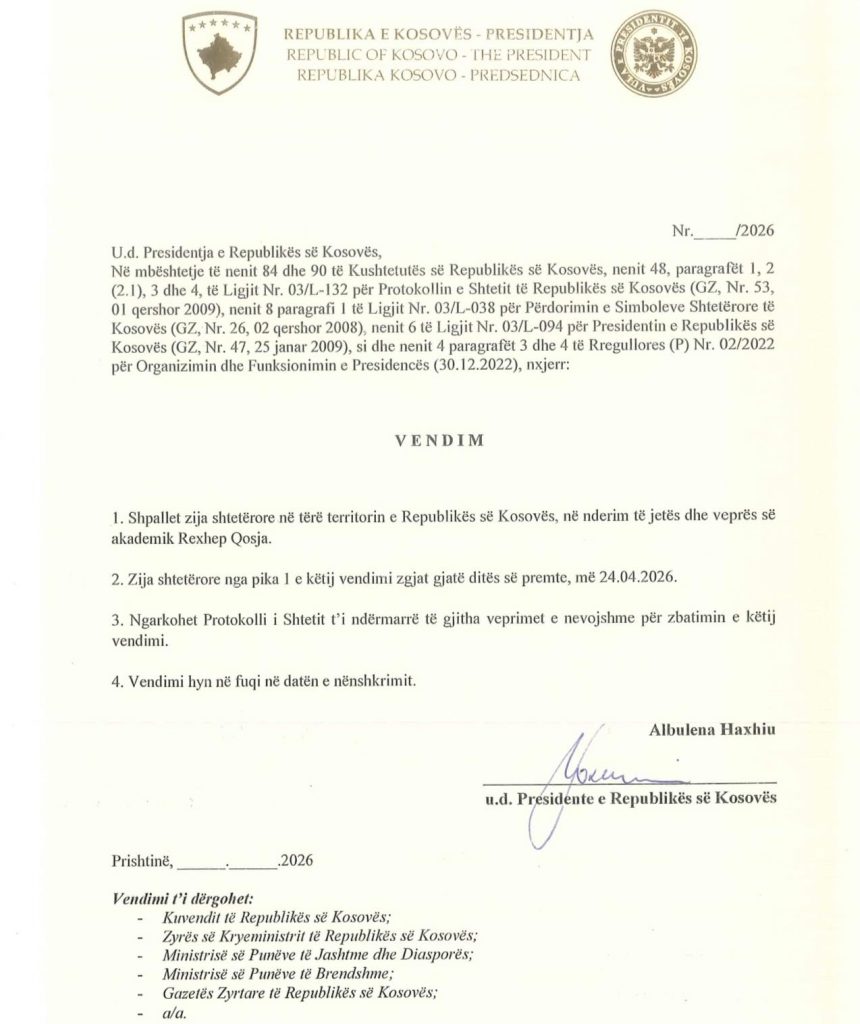 Kështu ka njoftuar ushtruesja e detyrës së presidentes, Albulena Haxhiu.