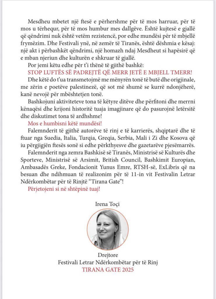 Në datat 8–10 tetor 2025, Tirana do të kthehet në qendër të letërsisë bashkëkohore me zhvillimin e Festivalit Ndërkombëtar Letrar për të Rinj “Tirana Gate”, në edicionin e tij të 11-të.