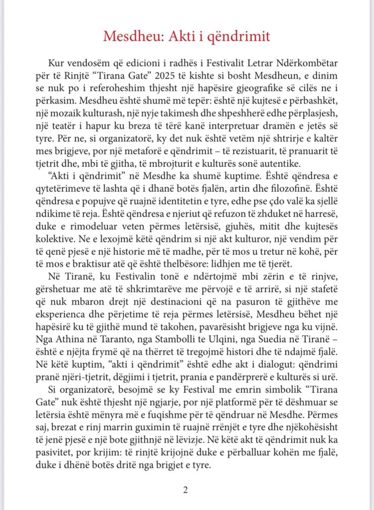 Tema qendrore e festivalit, “Mesdheu: Akti i qëndrimit”, bashkon autorë, përkthyes dhe studiues nga vende të ndryshme të Mesdheut dhe Evropës për të reflektuar mbi fjalën, kujtesën dhe rezistencën kulturore në kohët bashkëkohore.
