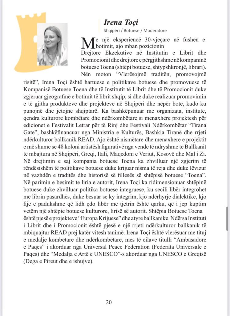 Në ditën e tretë, më 10 tetor, panelet do të përqendrohen në mitin, migrimin dhe rikthimin, me diskutime mbi mënyrën se si letërsia moderne ringjall rrëfimet e lashta dhe i përkthen ato në një gjuhë të re për brezat bashkëkohorë.