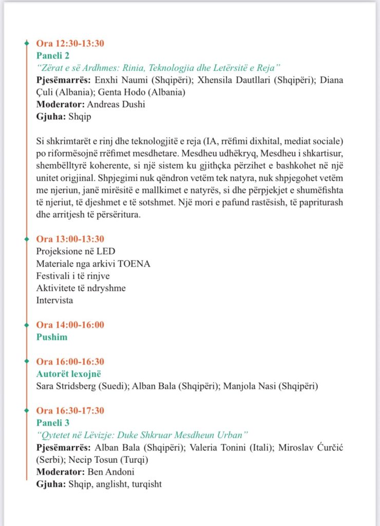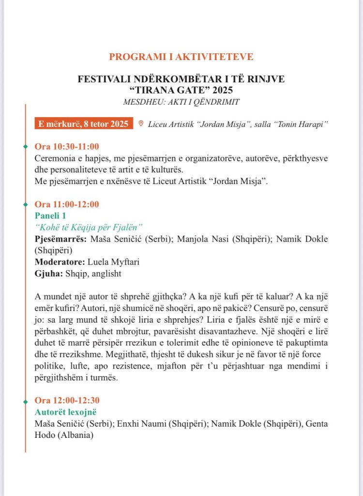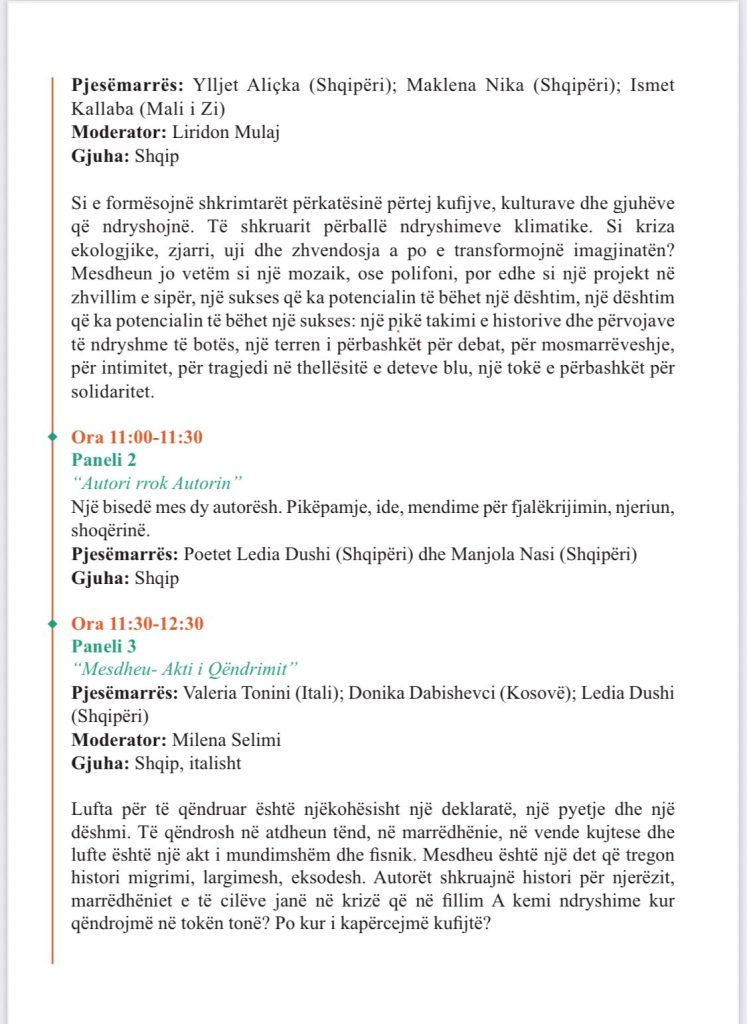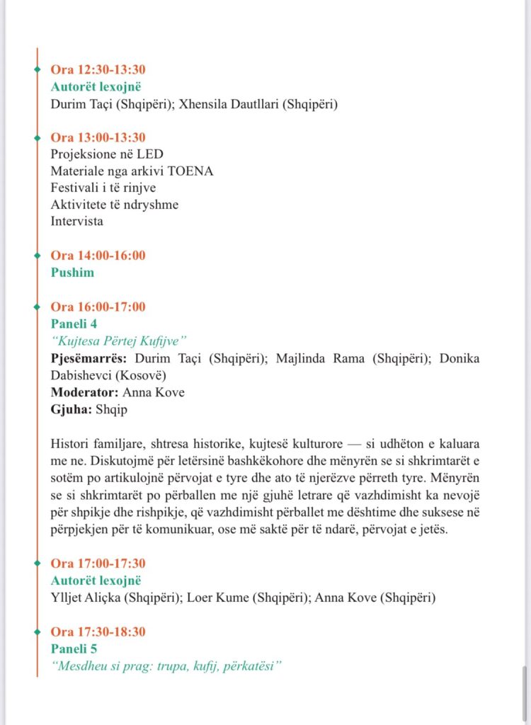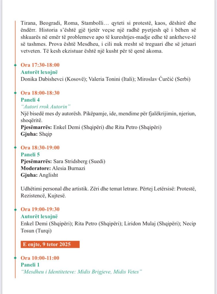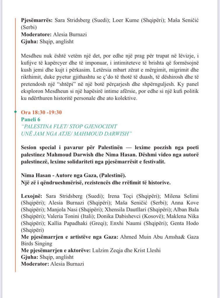 Në këtë frymë, programi i festivalit përfshin panele, lexime poetike, performanca dhe diskutime që prekin temat e identitetit, kujtesës, trupit, kufijve dhe qëndresës përmes letërsisë.
