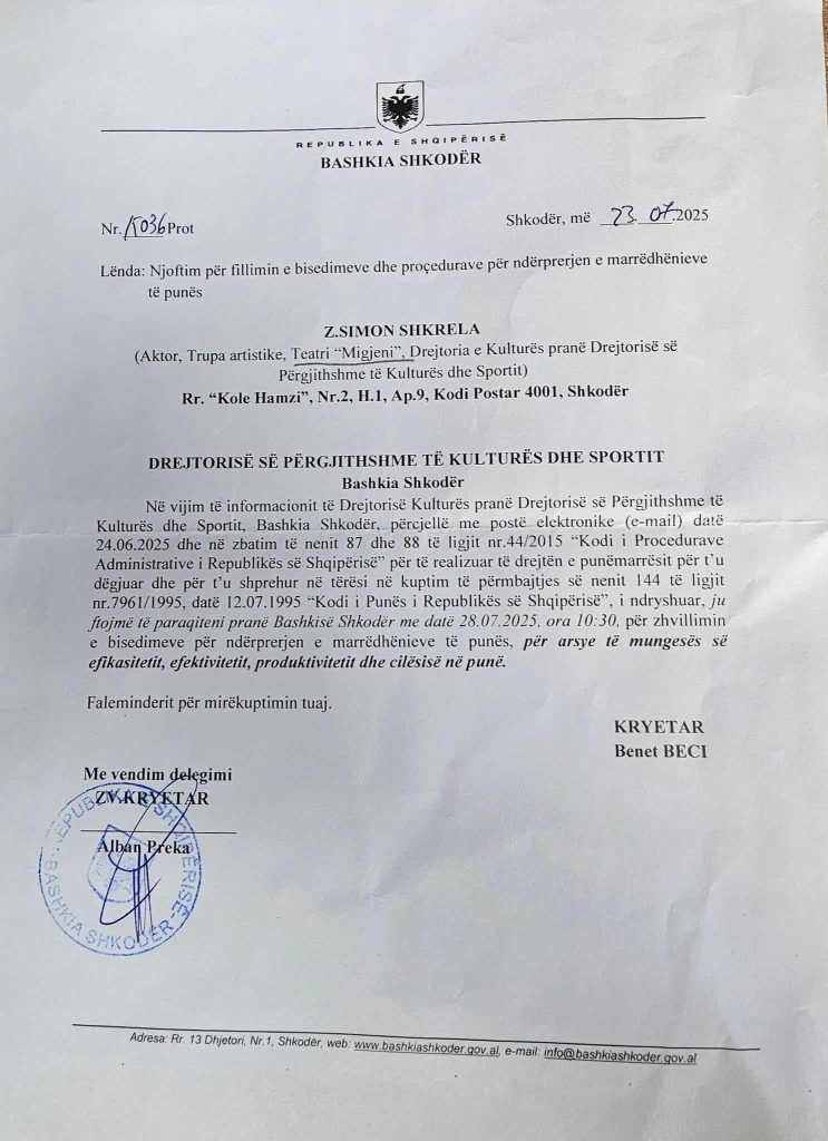 Aktori i njohur Simon Shkreli, ka reaguar ashpër pas njoftimit për nisjen e procedurës së shkarkimit të tij nga trupa e Teatrit “Migjeni” në Shkodër. Në një postim të publikuar në rrjetin social Facebook, Shkreli e cilëson vendimin si një letër të hartuar nga burokratë pa lidhje me artin dhe kulturën.