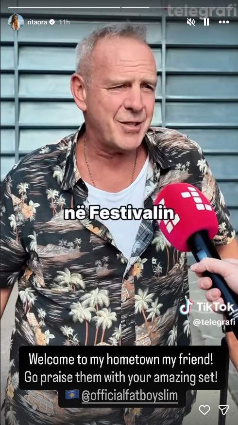 Përmes një postimi në InstaStory, Rita ka rishpërndarë intervistën që Fatboy Slim realizoi për Telegrafin pak pas mbërritjes në Kosovë, ku të tjera foli edhe për bashkëpunimin shumë të suksesshëm me vetë këngëtaren shqiptare në projektin “Praising You”.