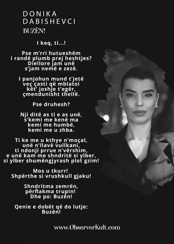 Poezia “Buzën” e Donika Dabishevcit është një shpërthim emocional e estetik i ndërthurjes midis pasionit, feminitetit dhe përkohshmërisë. Ajo i përket frymës së lirë dhe të guximshme të poezisë moderne shqipe, ku subjekti lirik femër artikulon dëshirën, revoltën, prekshmërinë dhe fuqinë krijuese në të njëjtën frymë.